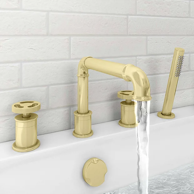 Arezzo Brushed Brass 4 Tap Hole Industrial Style Deck Mounted Bath Shower Mixer Tap inc. Pull Out Shower Handset