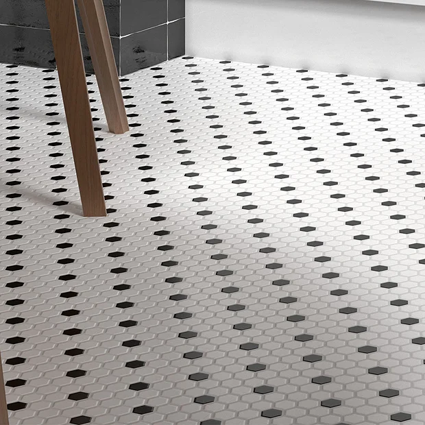 Add character to your kitchen or bathroom with the Ashford hexagon black and white mosaic tiles. It’s striking design can be used on walls or floors. Made from durable porcelain, these attractive tiles have a mixed finish.