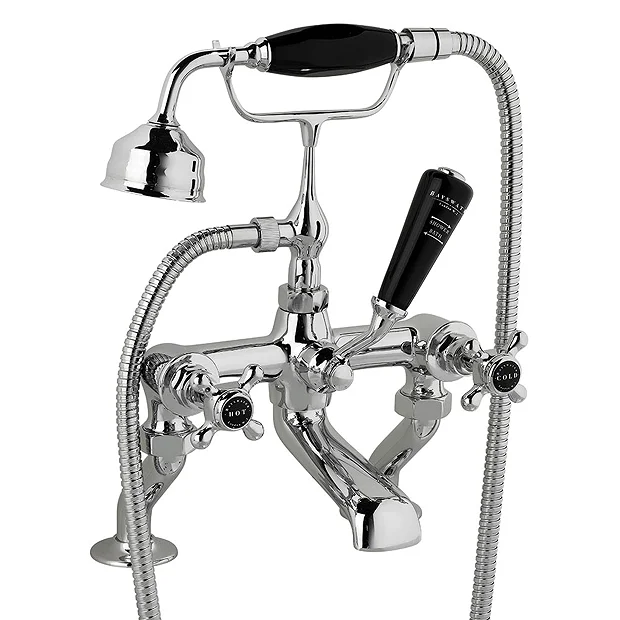 Beautifully crafted and inspired by Victorian and Edwardian designs, the Bayswater Black Crosshead Deck Mounted Bath Shower Mixer is the perfect upgrade for the traditional bathroom. It’s elegant crosshead handles and classic Black indices adds to the timeless look, while the ceramic disc technology ensures long life and smooth operation. Made from high grade brass with a durable chrome finish. Supplied with cradle, hose and telephone handset.