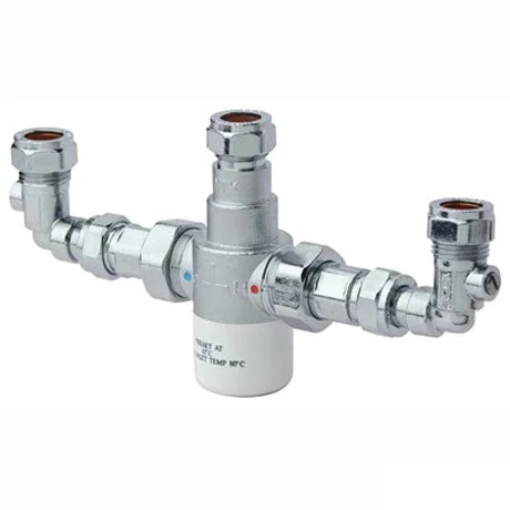 The Gummers 15mm Thermostatic Mixing Valve with Isolation Elbows blends hot water with cold water to ensure constant, safe shower and bath outlet temperatures, preventing scalding. TMV and WRAS approved.