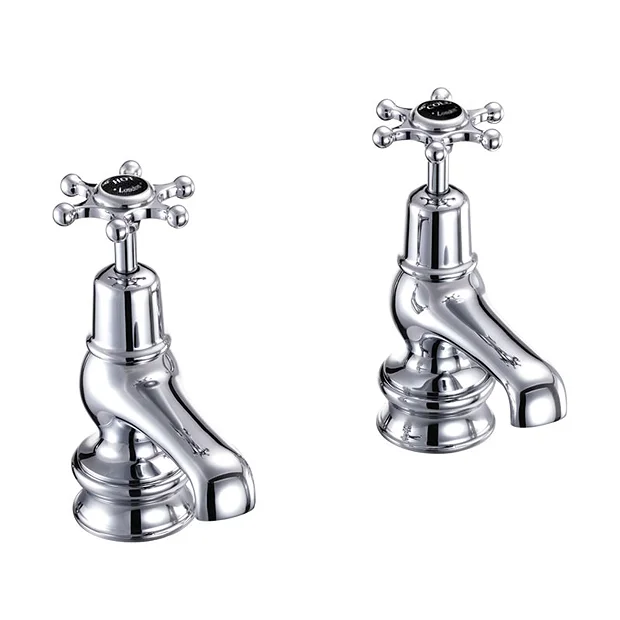 The Burlington Birkenhead tap range with black ceramic indices is the perfect complement to Burlington’s Jet Black range. These basin taps are constructed from brass and beautifully finished in chrome. The Regent base gives the tap a ridged, slightly taller, elegant appearance. It features traditional screw down valves and come supplied as a pair.