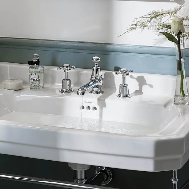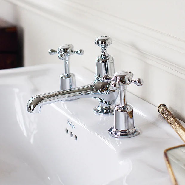 The Claremont 3 tap hole basin tap with pop up waste from Burlington, features a classic traditional design and manufactured to the highest standards using the latest technology. Create the perfect period bathroom with our range of quality chrome plated traditional taps. Comes with a 10 year guarantee.