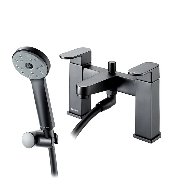 The innovative Deva Amio Matt Black Bath Shower Mixer Tap features a stylish lever design with a Curved Body, The Deva Amio Curved Bath Shower Mixer Tap with its minimalist design will bring a touch of sophistication to any bathroom. Includes handheld shower head, wall bracket and flexible hose.