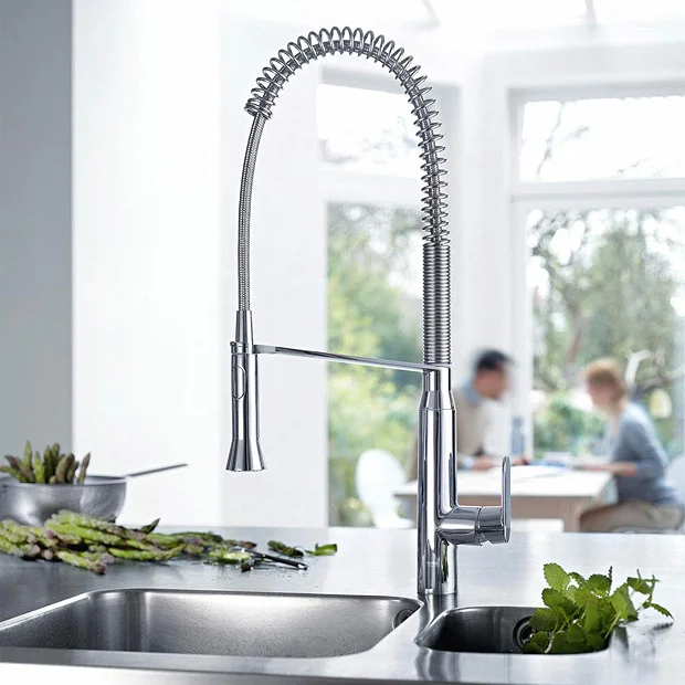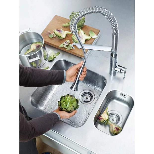 The K7 Kitchen Sink Mixer has been designed to provide professional-grade functionality. A sleek and striking design, the tap features a professional spray that swivels in a 360° radius, offering the choice of a fine spray jet and a powerful shower jet. The tap is manufactured from high grade stainless steel and comes finished in GROHE StarLight® chrome coating, an ultra smooth finish that is scratch resistant and easy to clean.