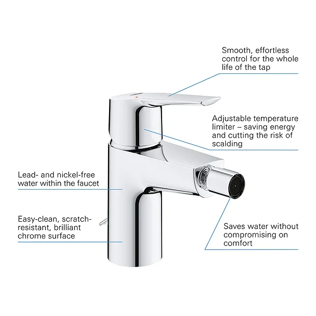The Grohe QuickFix Start bidet mixer is an ideal, easy update for your modern bathroom, with clean lines and water saving technology plus hassle free installation. Inside the GROHE SilkMove ceramic cartridge offers durable, precise volume and temperature control via the solid metal lever. The integrated temperature limiter saves energy, while GROHE EcoJoy technology reduces your water consumption to 5.7 l/min without compromising on performance. The ball-joint aerator allows you to direct the flow accurately. The clean look is enhanced with the clever retractable chain which keeps the plug almost invisible behind the tap when not in use.
