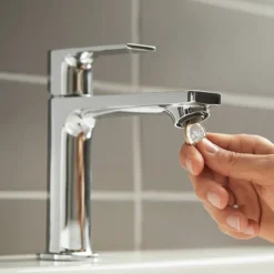 The harmonious design of Rebris E with its gentle edges, has a modern and elegant look. This single lever basin mixer offers an economical way of adding designer elegance to your bathroom. AirPower technology adds generous amounts of air to the water, creating a soft, splash-free spray while EcoSmart technology reduces the flow rate to save water and energy.