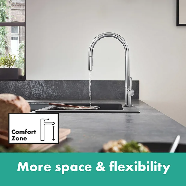 German engineered using premium materials and quality workmanship, the hansgrohe Talis M54 Single Lever Kitchen Mixer is water efficient and adds a stylish highlight to any kitchen. It features a pull out spray with 2 spray functions suitable for different uses and a QuickClean rub clean aerator that loosens any limescale deposits making sure your tap looks beautiful, and stays working for longer.