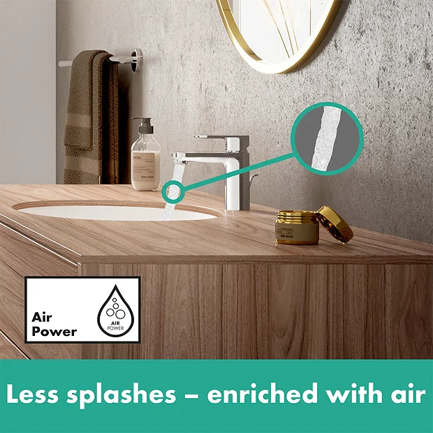 The harmonious design of Vernis Blend, with its gentle curves, has a modern and elegant look. This single lever basin mixer offers an economical way of adding designer elegance to your bathroom. AirPower technology adds generous amounts of air to the water, creating a soft, splash-free spray while EcoSmart technology reduces the flow rate to save water and energy.