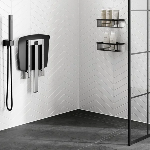 HiB’s shower seat with support leg offers a high quality solution with a desirable compact design for extra reassurance. The foldable system is also available in a white finish. Can be securely fixed to hold up to 23 stone (150kgs)